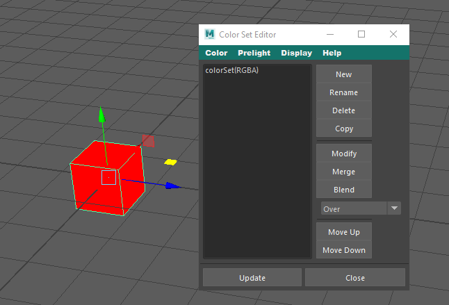 Meshに設定されているcolorSetをArrayで取得し、もしcolorSetがなければcreateColorSetで新しいカラーセット "colorSet" を作成し、作成したカラーセットをsetCurrentColorSetNameで現在のカラーセットに設定します