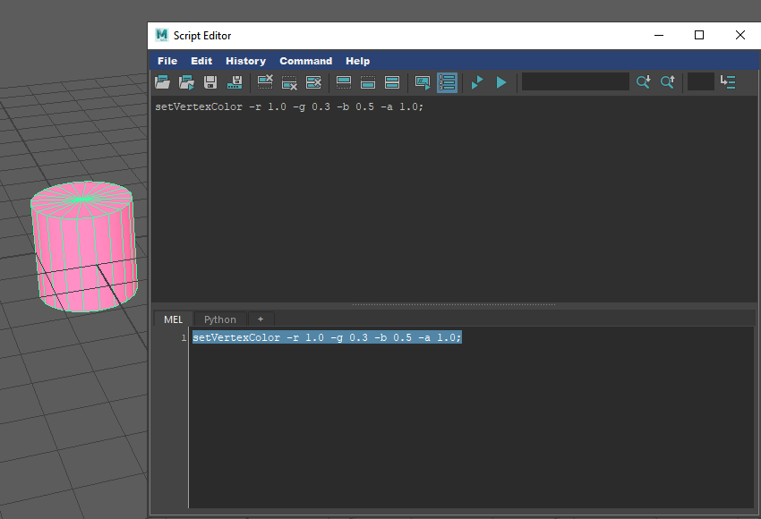 前回の記事ではsetVertexColor;とscriptEditorで実行すると赤色にvertexcolorをつけれるようにしました
