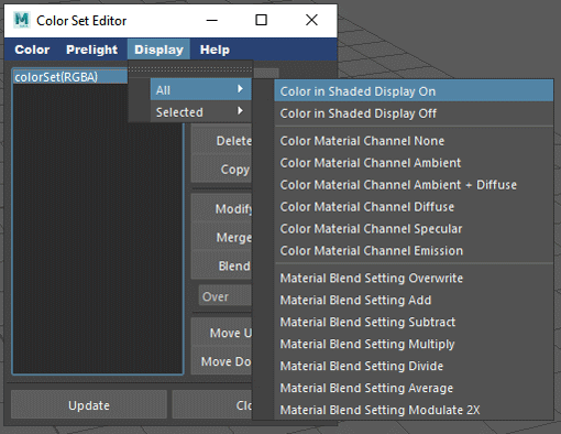 実行後、Color Set Editor>Display>All>Color in Shaded Display On
