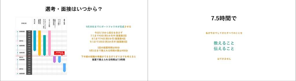 背景の授業をしては無駄だと思い、授業内容を一気にそれぞれの学生が目指している職業に就くためには何をすべきかということを最初に伝え、そのあとは成果物に対してディスカッションしていくという形式にしました。