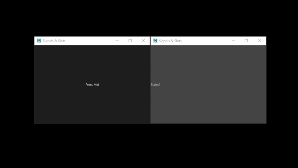 実行後、QPushButtonを押すと片側のUIのQLabelが変化するはずです