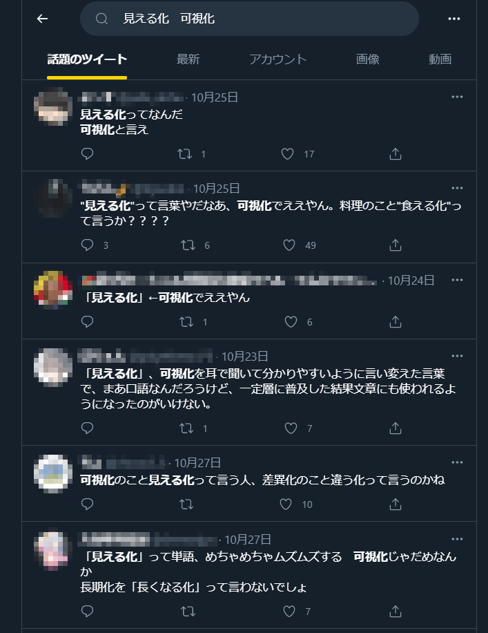 例えば、TwitterなどのSNSで見える化と可視化を組み合わせて検索すれば「見える化ってなんだ 可視化と言え」「「見える化」、可視化を耳で聞いて分かりやすいように言い変えた言葉で、まあ口語なんだろうけど、一定層に普及した結果文章にも使われるようになったのがいけない。」など