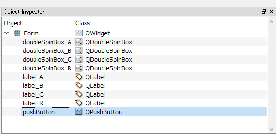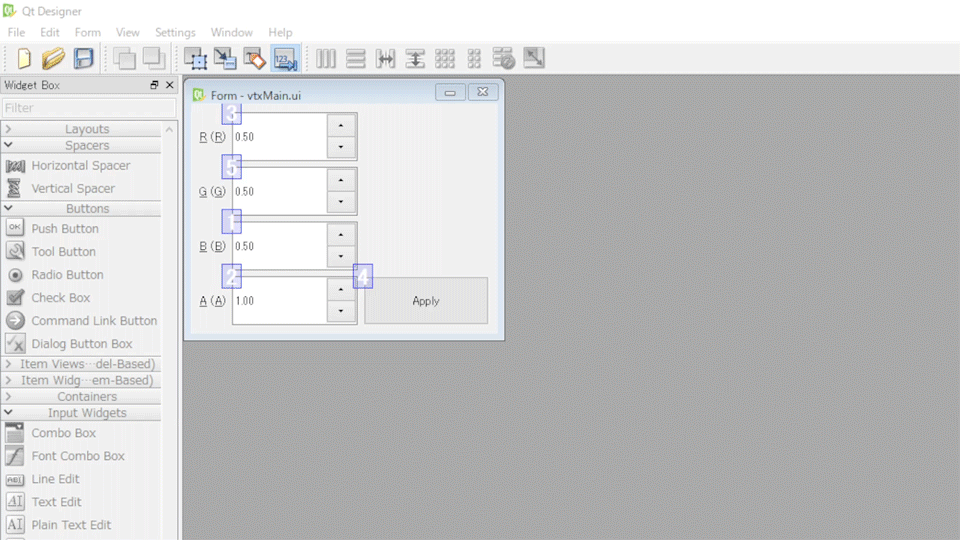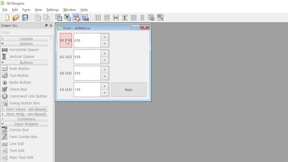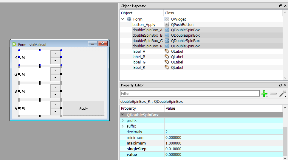 複数のQDoubleSpinBoxを選択し、Property>QDoubuleSpinBox>signaleStepを1.0から0.01に変更することで解決します ついでにvalueのMaxの値やデフォルトのValueも変更しておきます Alphaに関してはValueを1.0にしておきましょう