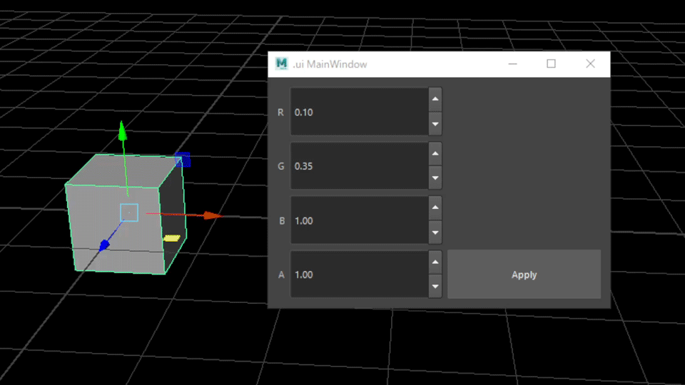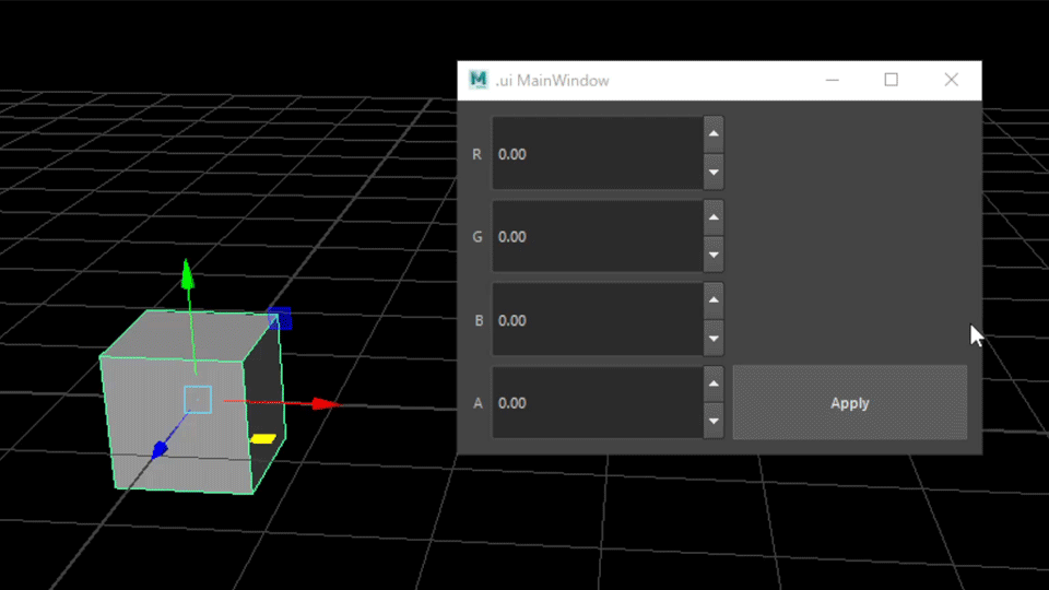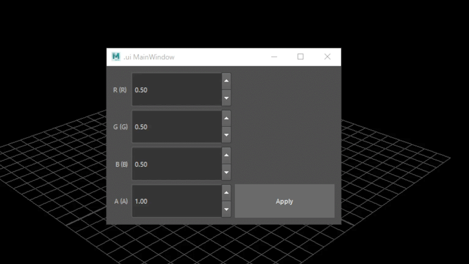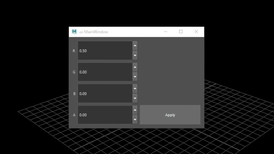 さて、ここまでは実際にGUIからMayaのコマンドを実行することはできたと思いますが一つここで問題があります GUIにはRGBAそれぞれに対して値を設定できるはずですが今のままではただ、任意に指定したカラーが設定されるだけになっています もちろんものによってはそれでいいのかもしれませんが今回はGUI上で変更した内容が反映されるようになっていなければなりません