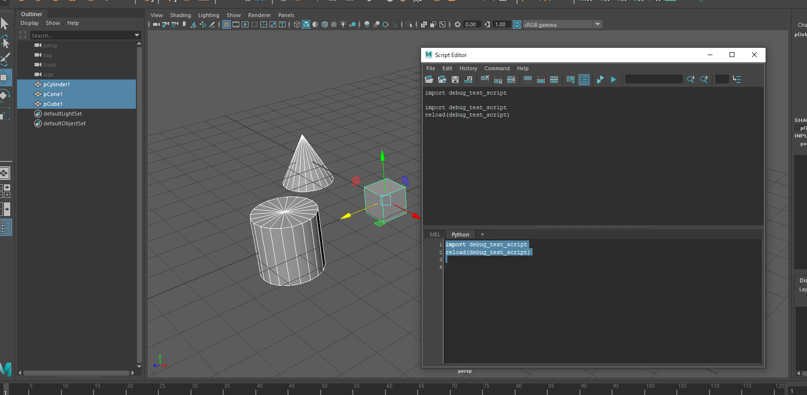 Mayaで適当にオブジェクトを作成して、選択状態にし、ScriptEditor上でコードを実行します