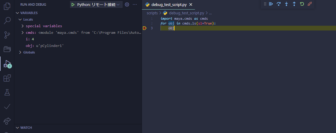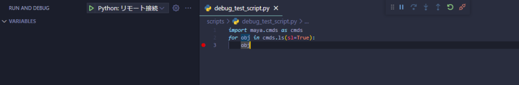 テスト用のpythonファイルを用意し、ブレークポイントを張り、F5でMayaとアタッチします